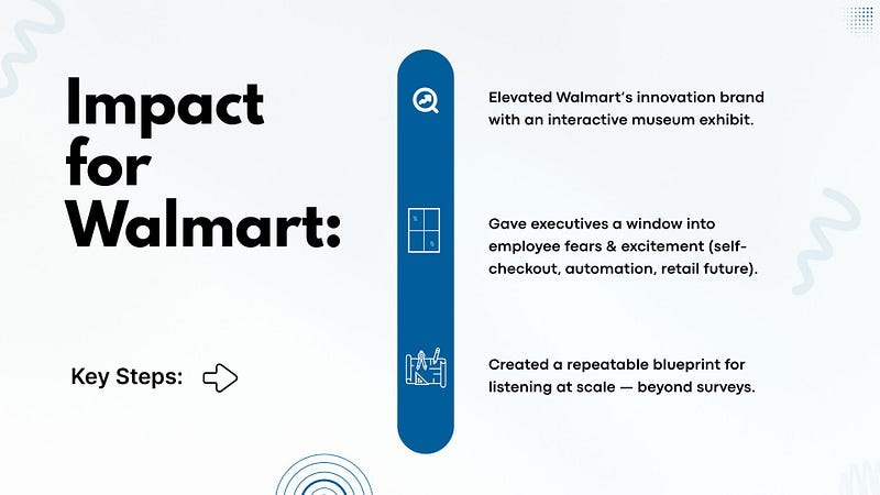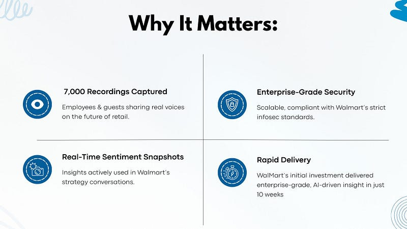 Specifically: the Walmart Heritage Museum. We helped turn a small corner of it into a living microphone, with thousands of 30‑second videos from associates and guests, piped through an AI pipeline, and answered back as executive‑ready insights. It’s oddly simple, a little weird, and very effective.