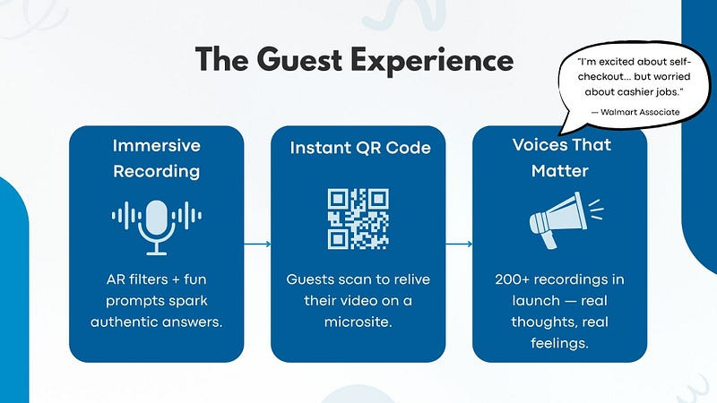 Also: no PII, tight retention, and it had to be fun enough that real people would participate. That’s the brief we worked under with Bridgewater Studio, Walmart’s exhibit partner.