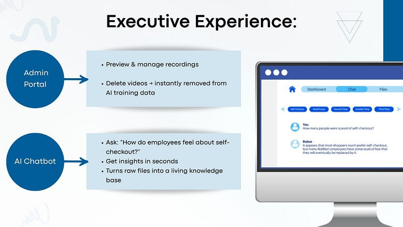 Admins get a clean portal and a conversational dashboard. Ask, “How do employees feel about self‑checkout?” and get defensible roll‑ups with counts, themes, and representative quotes, all sourced back to real clips. Designed for analysis ranging from quick & dirty to deep insights.